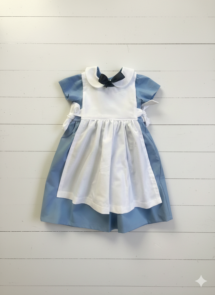 This adorable Alice in Wonderland-inspired set features a blue dress with white peter pan collar and detached white apron pinafore.
