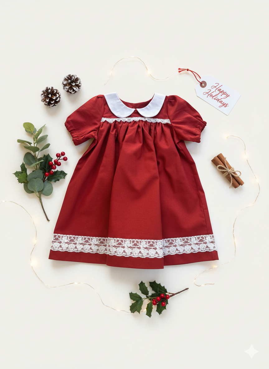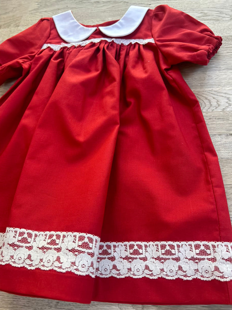 This classic, little red dress features a peter pan collar and vintage lace trim. Dress is ready to ship in a size 3t.