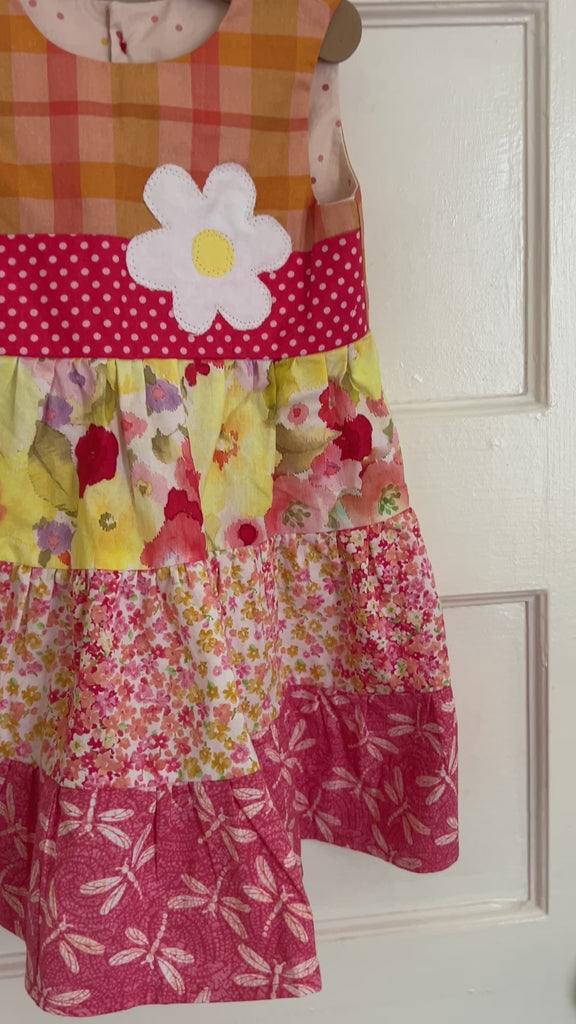 Bring a burst of sunshine to your little one’s wardrobe with this one-of-a-kind handmade patchwork dress! Featuring a playful mix of vibrant florals, polka dots, gingham, and a sweet daisy applique, this dress is perfect for twirling through spring days, summer picnics, or special occasions.