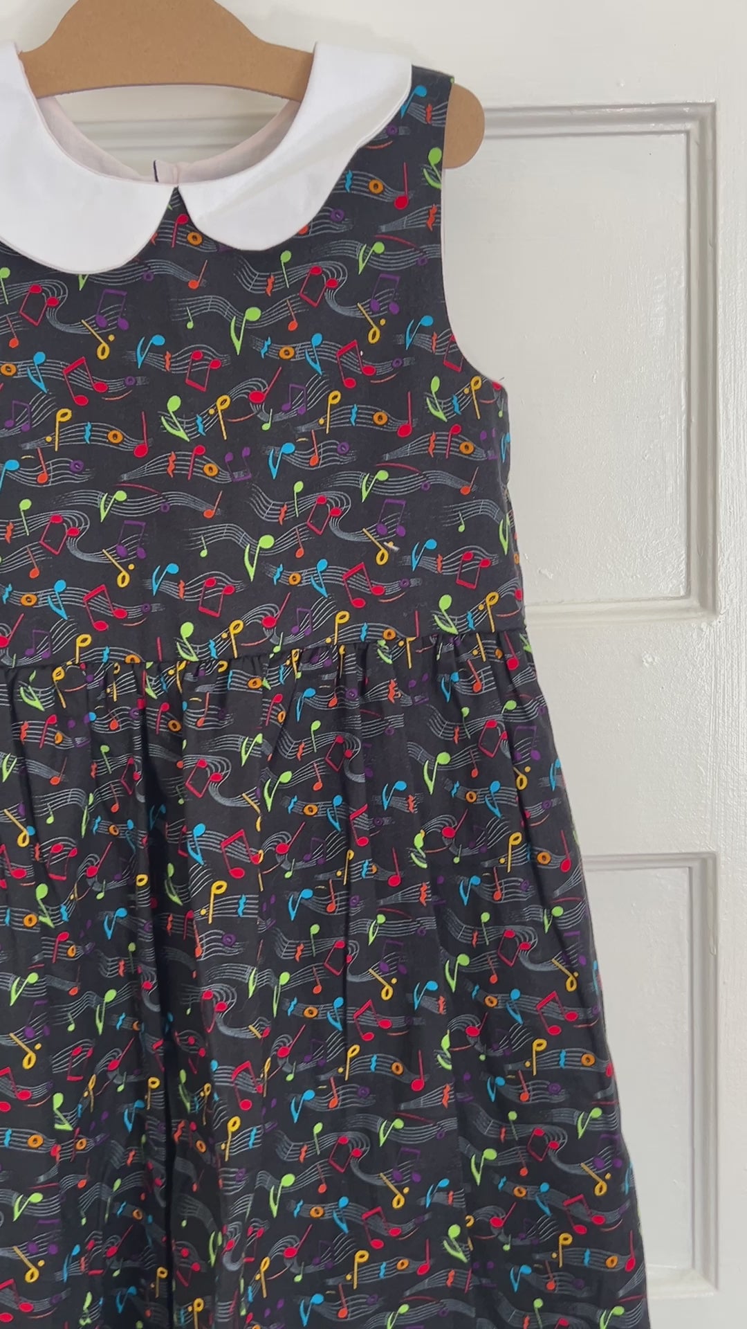 Let your little one shine in this one-of-a-kind handmade dress, perfect for music lovers and budding performers! This sleeveless dress features a vibrant all-over musical notes print on a black background, accented with a crisp white Peter Pan collar for a classic, playful touch.